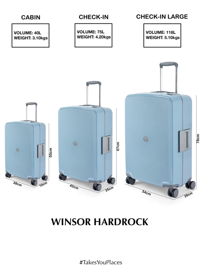 The Winsor Hard Rock is a premium zip-less luggage model designed to offer exceptional durability, security, and style for modern travelers. With its robust construction and innovative latch system, the Hard Rock provides a sophisticated alternative to traditional zipper-based luggage.
