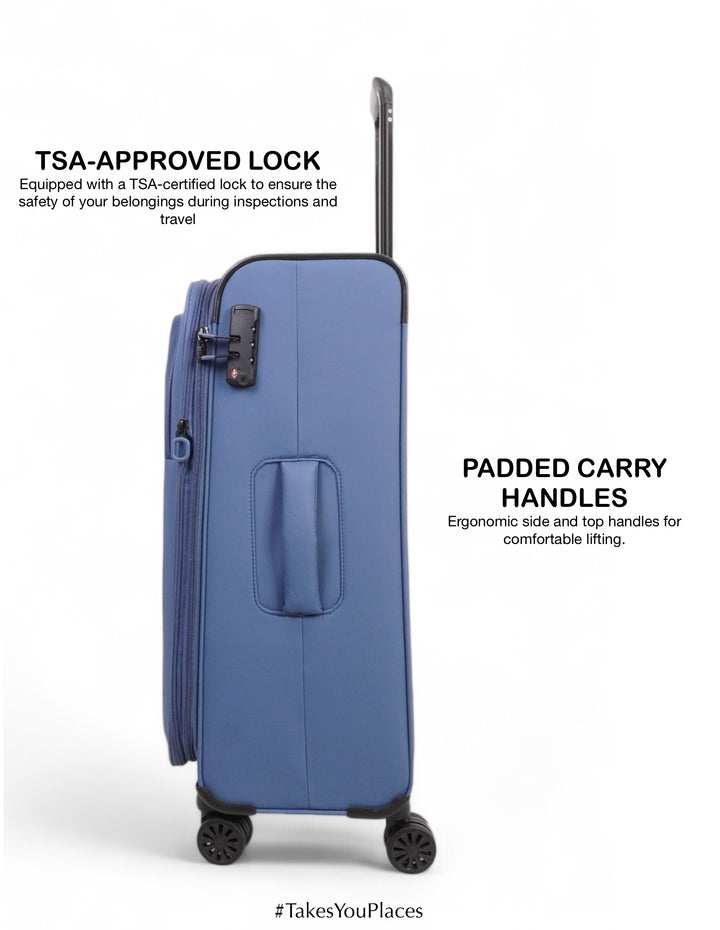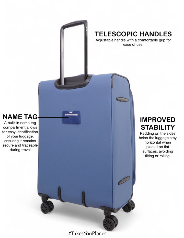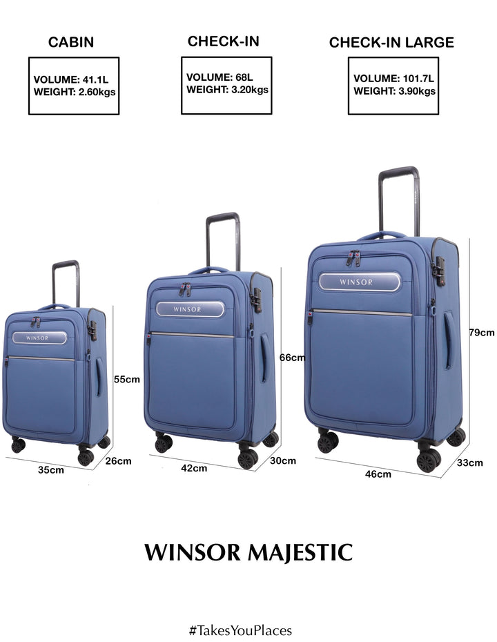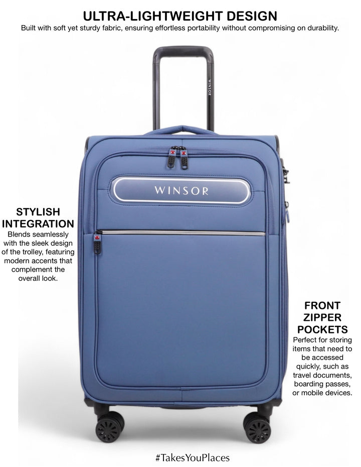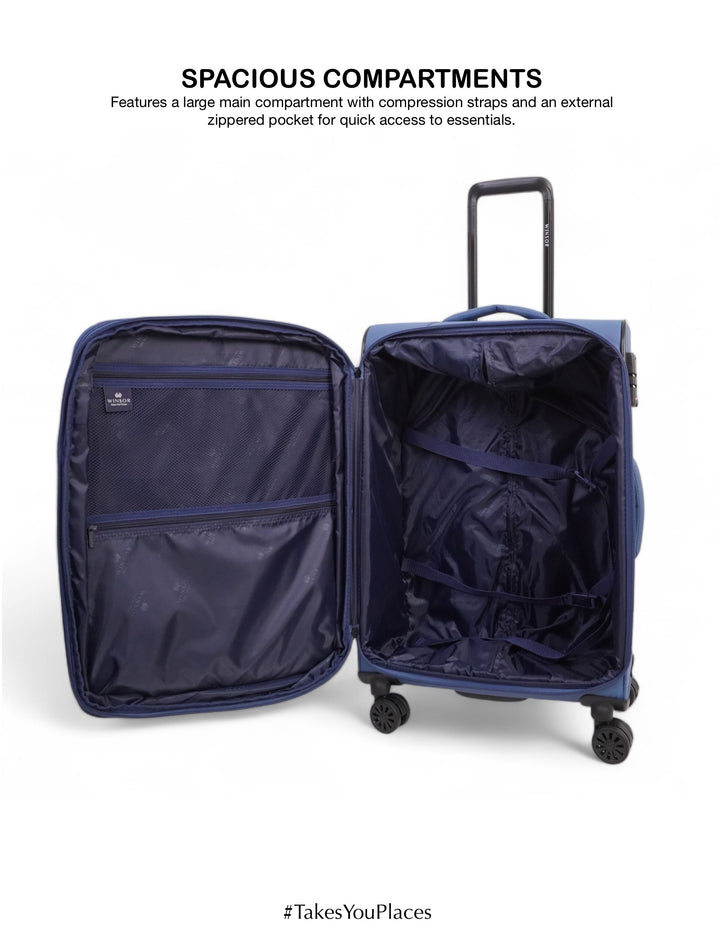 Travel in style and comfort with the WINSOR Majestic Soft Luggage. Crafted for durability and elegance, this luggage combines a sleek design with exceptional functionality. Its lightweight yet sturdy construction ensures hassle-free portability, while the spacious interior and smart compartments provide ample room for all your travel essentials. Equipped with 360° spinner wheels and a telescopic handle, the Majestic glides effortlessly on any terrain, making your journeys smoother than ever. Ideal for both business trips and vacations, WINSOR Majestic Soft Luggage is your perfect travel companion that truly #TakesYouPlaces.