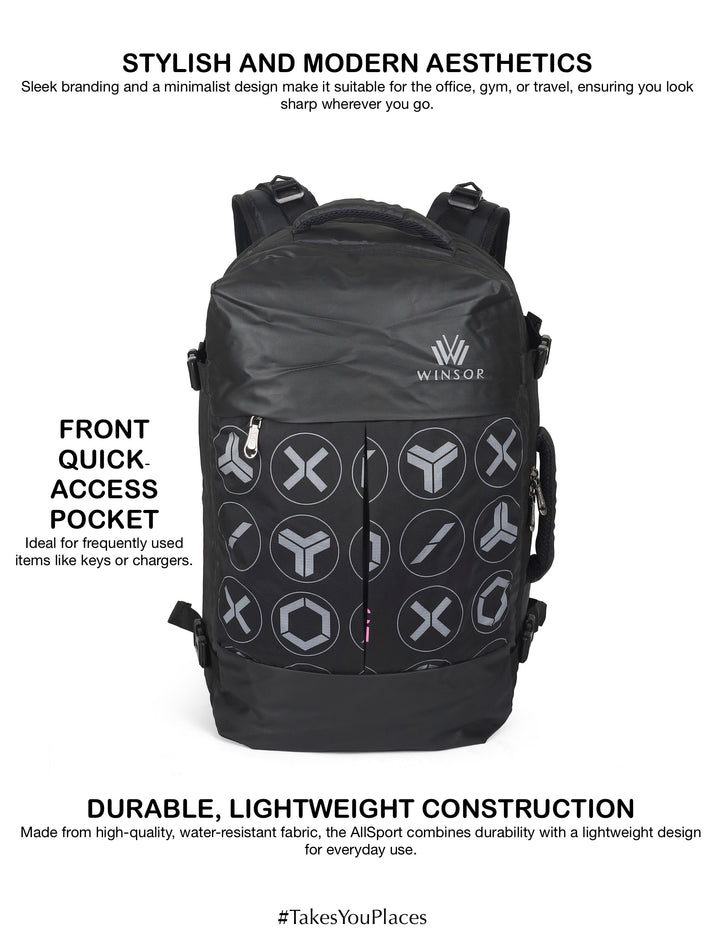 Winsor AllSport is designed for individuals who juggle work, fitness, and travel. Combining the utility of a backpack with the spaciousness of a gym bag, it offers ultimate functionality while ensuring your belongings remain protected with its included rain cover. Perfect for professionals, gym enthusiasts, and adventurers, this bag adapts to your lifestyle with ease and style.