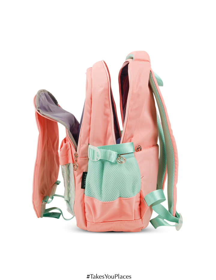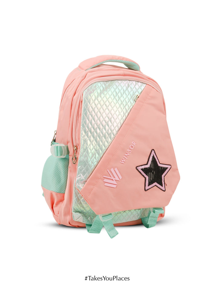 Shine bright every day with the Winsor StarGlow Backpack – a chic blend of fashion and functionality. Featuring a pastel peach body with mint green quilted accents and a bold star patch, this backpack is perfect for school, outings, and casual adventures. Lightweight yet spacious, StarGlow combines trendy design with smart storage to keep you stylish and organized on the go.